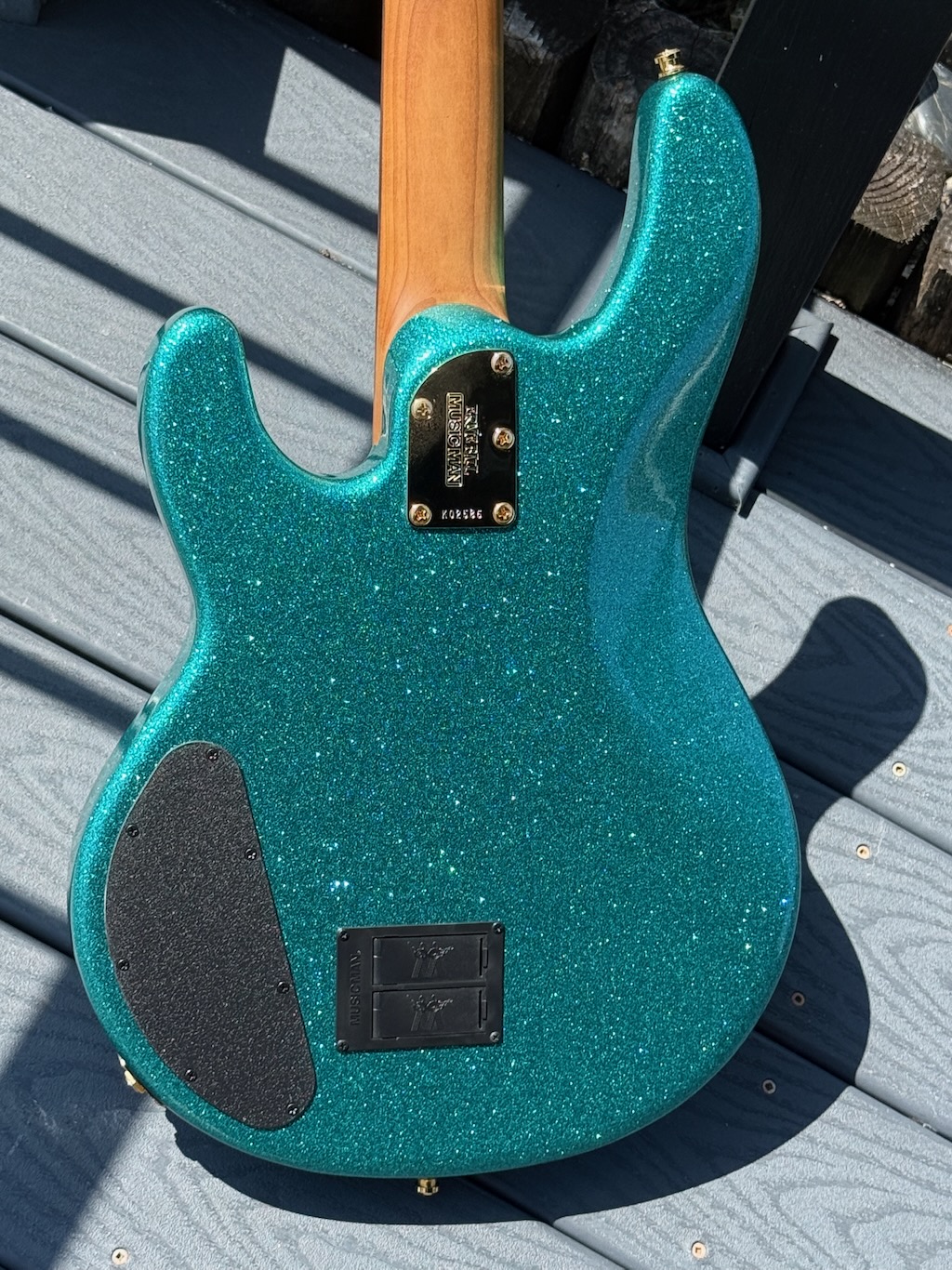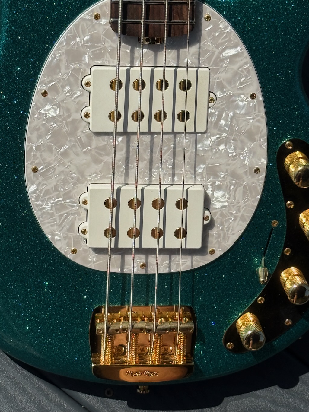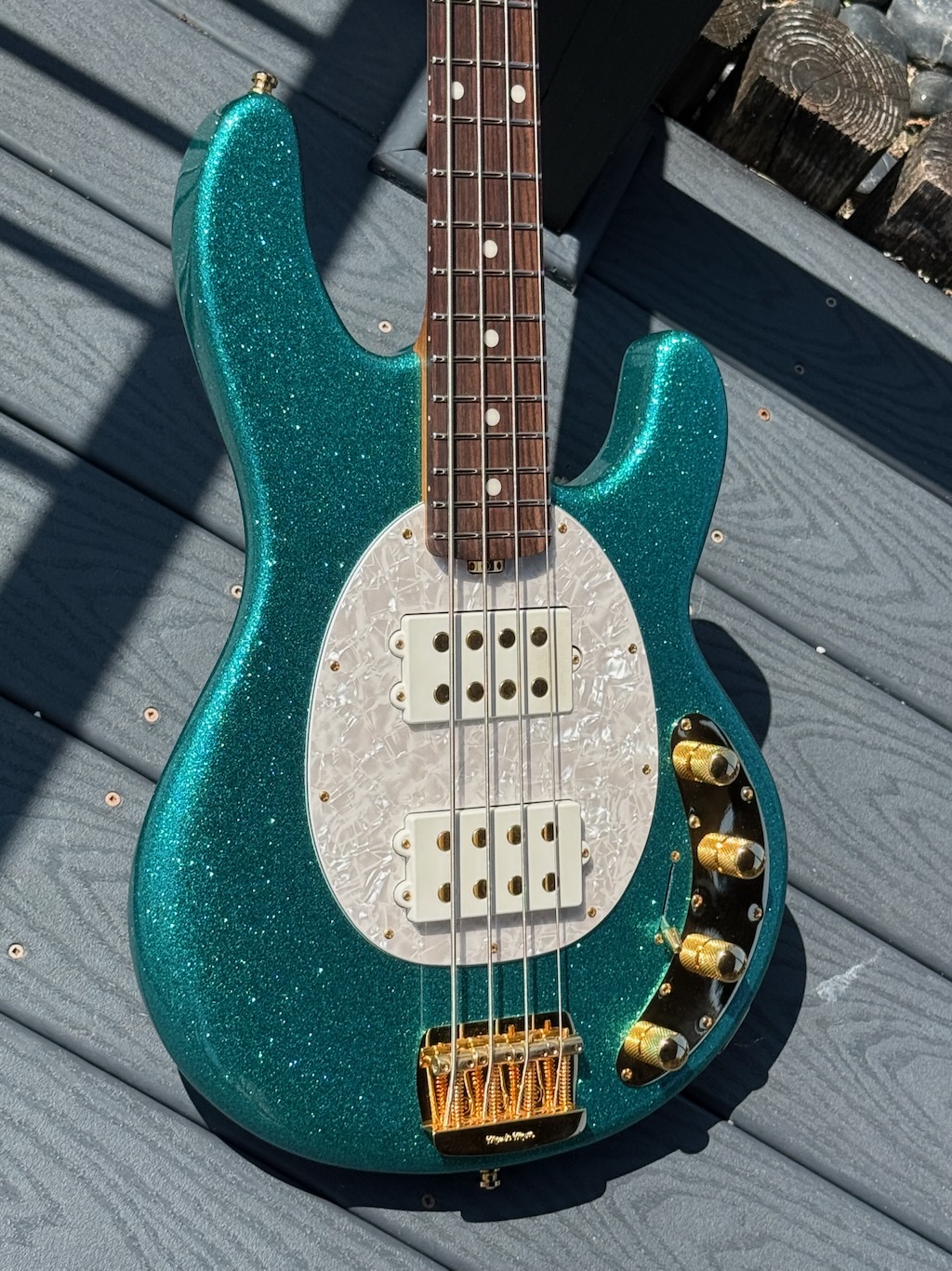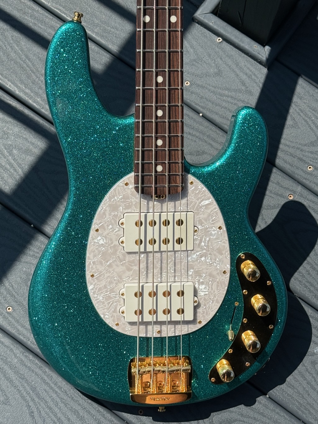 This is an extremely cool Music Man Stingray Special HH Bass from 2024. It’s got a fantastic Turquoise Sparkle finish all over its alder body w/a matching Sparkle Headstock & a bad ass White pearloid pickgard. Its factory Gold hardware make this one of the prettiest examples ever made. It’s got 2 powerful HH active pickups. Its rosewood neck feels delicious. This bass has ridiculous range with two humbucking pickups, a five way selector that allows you to split the coils of each pickup and run them parallel, and a 3-band active EQ with a massive 18v preamp, this StingRay is a monster across the board, able to give any possible tone you could want out of a 4 string bass. This is mint & has hardly been touched ever, all original & comes w/its original padded hard case.