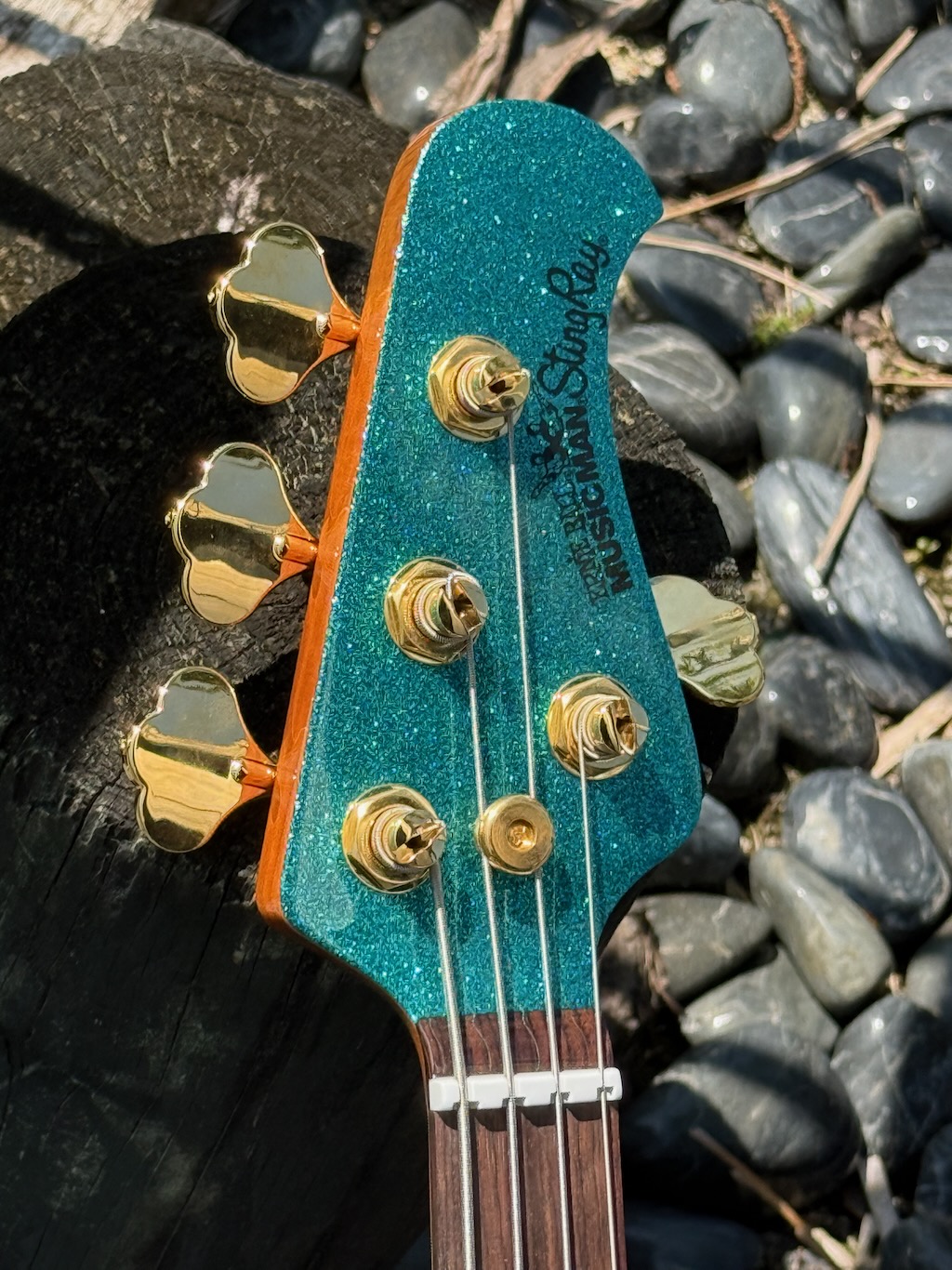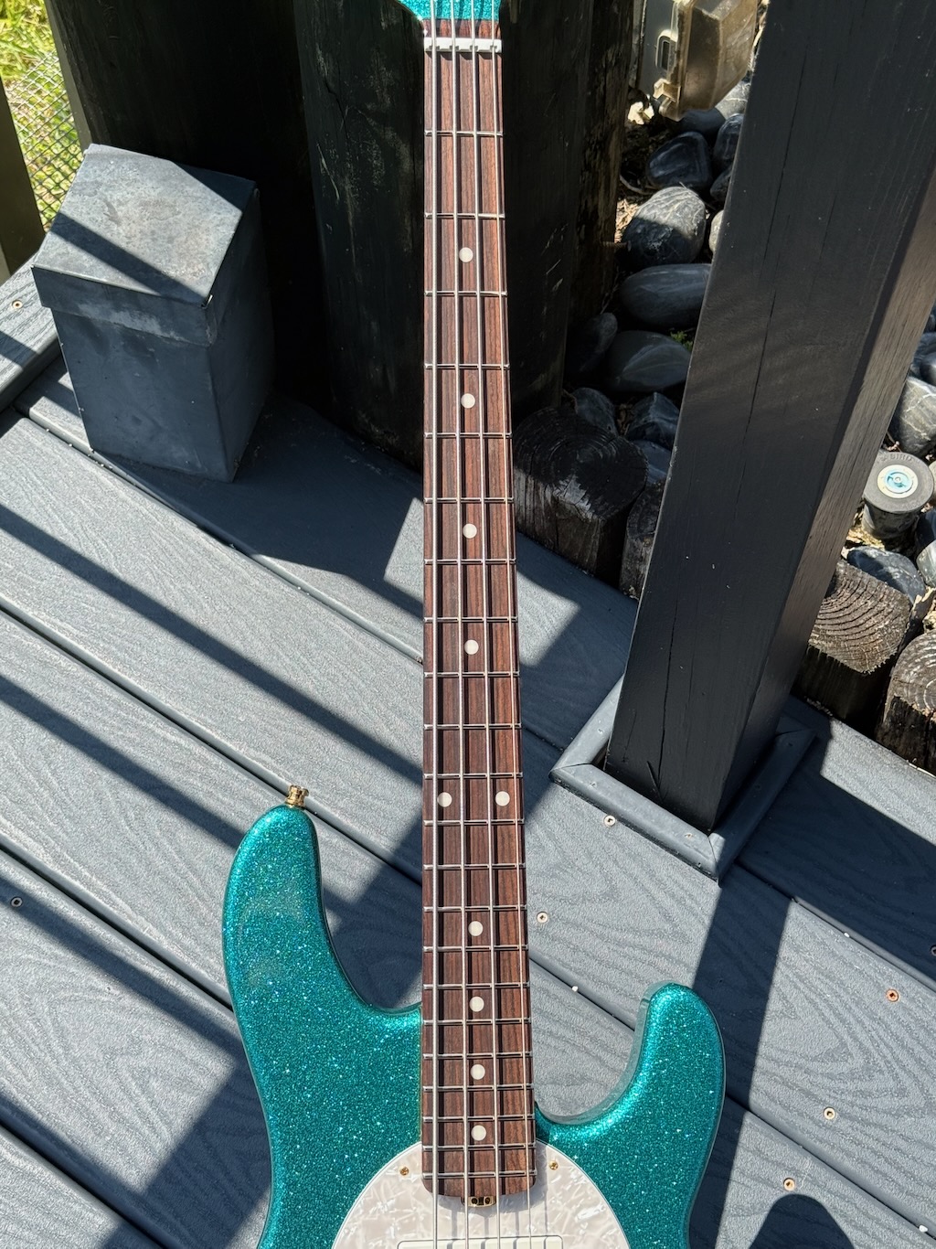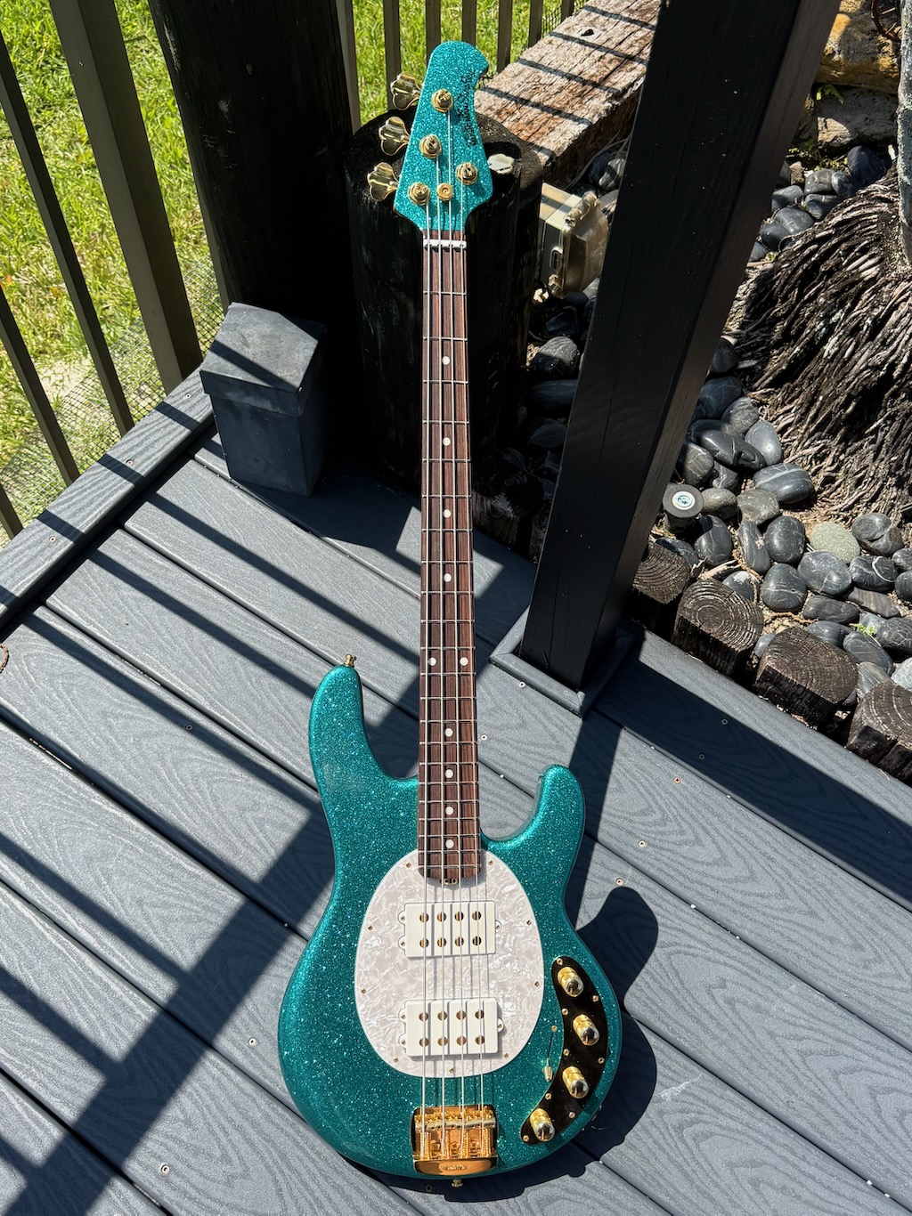 This is an extremely cool Music Man Stingray Special HH Bass from 2024. It’s got a fantastic Turquoise Sparkle finish all over its alder body w/a matching Sparkle Headstock & a bad ass White pearloid pickgard. Its factory Gold hardware make this one of the prettiest examples ever made. It’s got 2 powerful HH active pickups. Its rosewood neck feels delicious. This bass has ridiculous range with two humbucking pickups, a five way selector that allows you to split the coils of each pickup and run them parallel, and a 3-band active EQ with a massive 18v preamp, this StingRay is a monster across the board, able to give any possible tone you could want out of a 4 string bass. This is mint & has hardly been touched ever, all original & comes w/its original padded hard case.