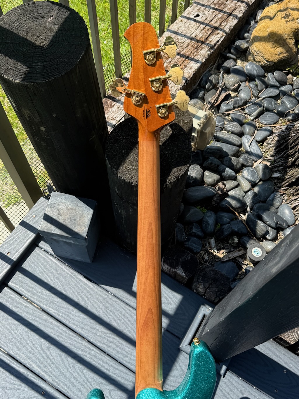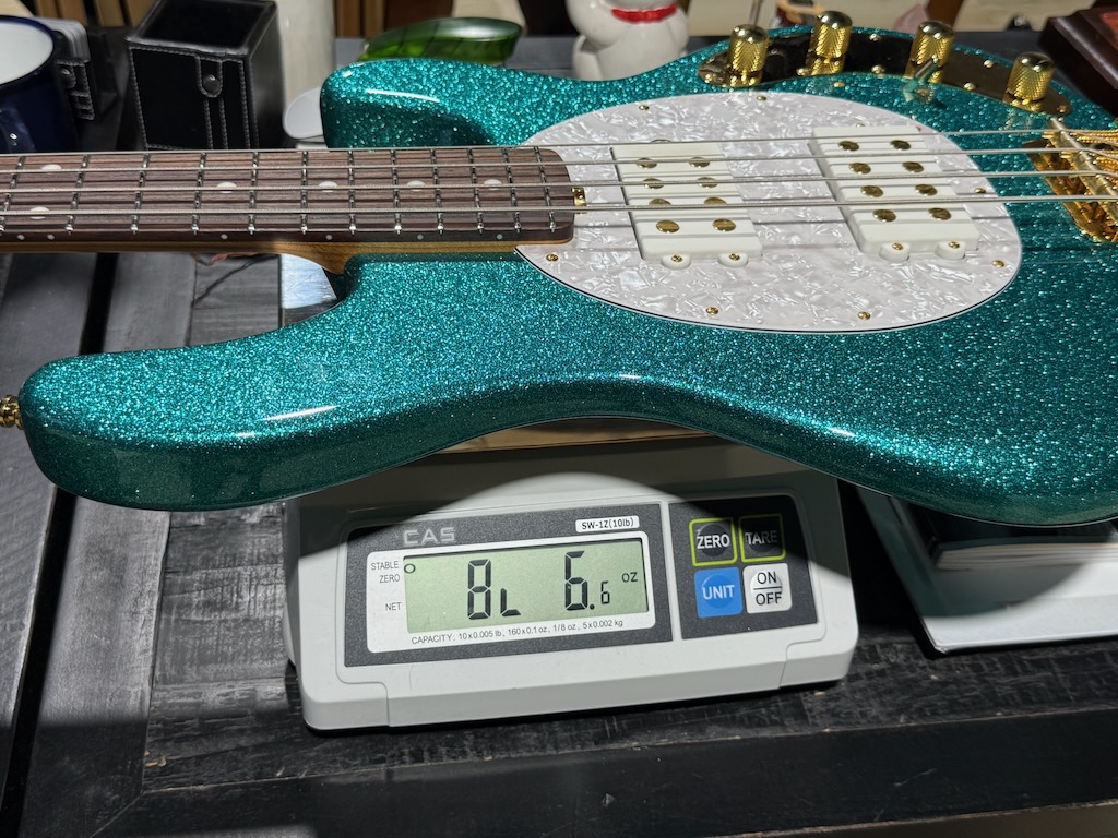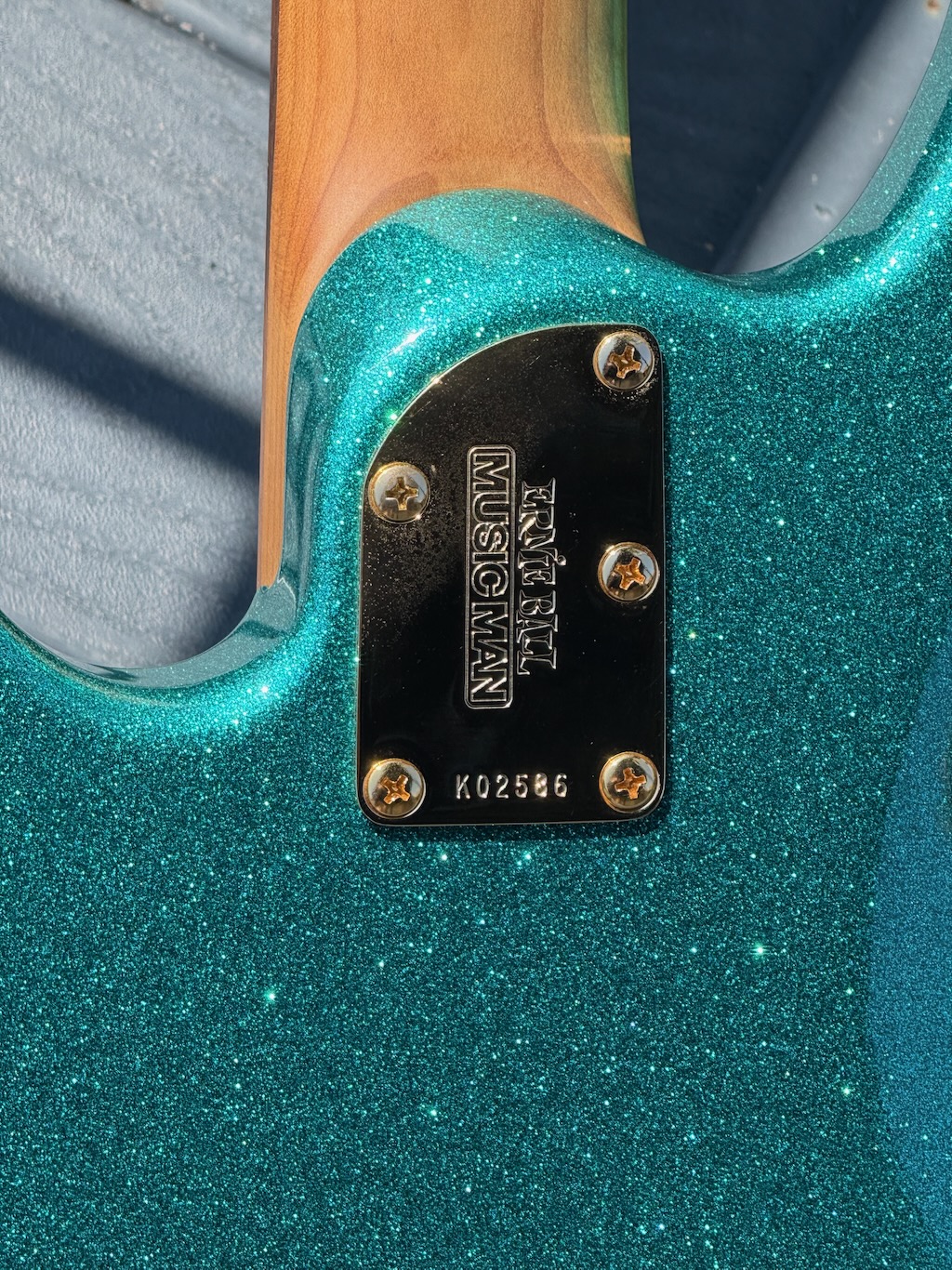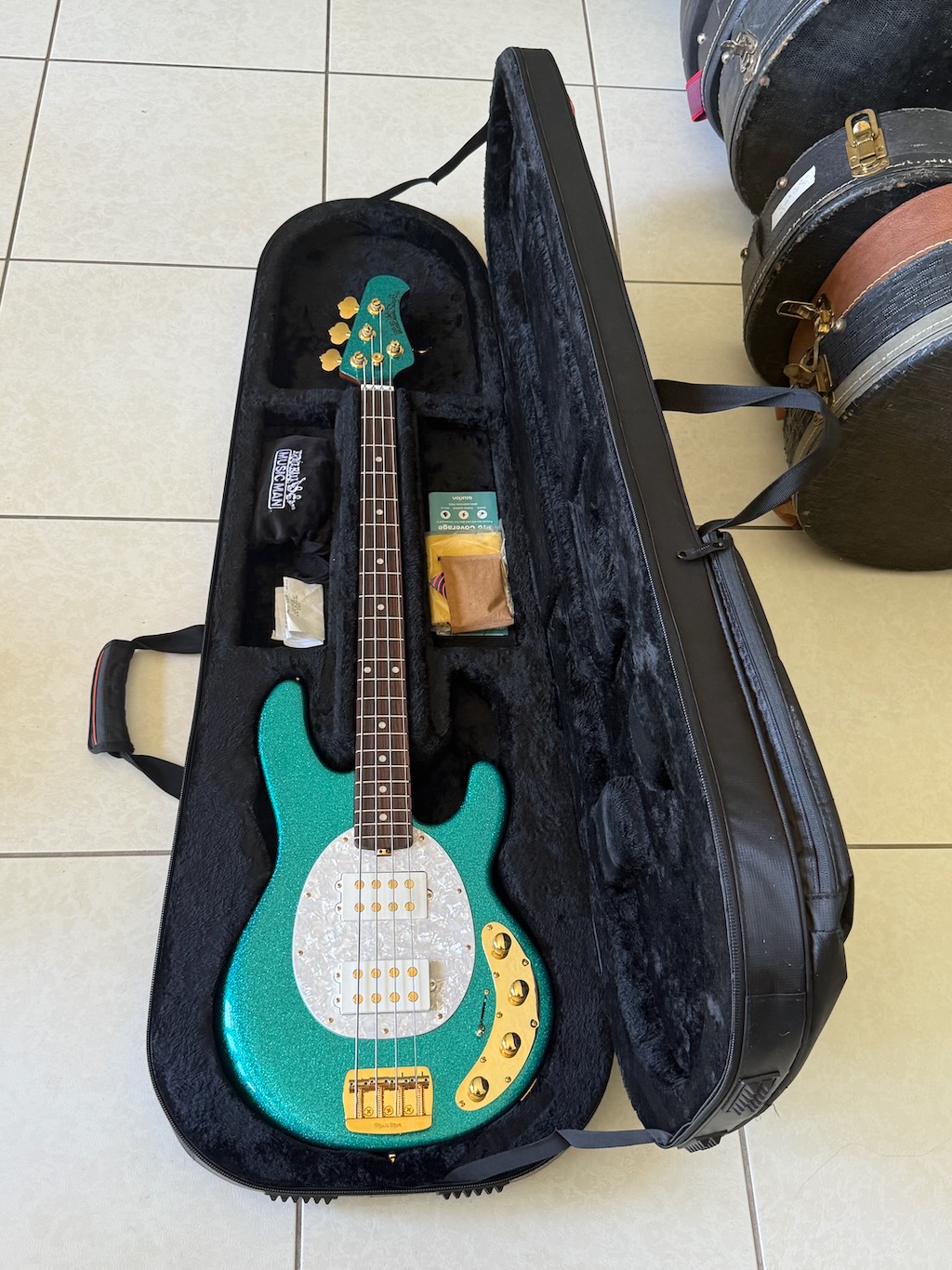 This is an extremely cool Music Man Stingray Special HH Bass from 2024. It’s got a fantastic Turquoise Sparkle finish all over its alder body w/a matching Sparkle Headstock & a bad ass White pearloid pickgard. Its factory Gold hardware make this one of the prettiest examples ever made. It’s got 2 powerful HH active pickups. Its rosewood neck feels delicious. This bass has ridiculous range with two humbucking pickups, a five way selector that allows you to split the coils of each pickup and run them parallel, and a 3-band active EQ with a massive 18v preamp, this StingRay is a monster across the board, able to give any possible tone you could want out of a 4 string bass. This is mint & has hardly been touched ever, all original & comes w/its original padded hard case.