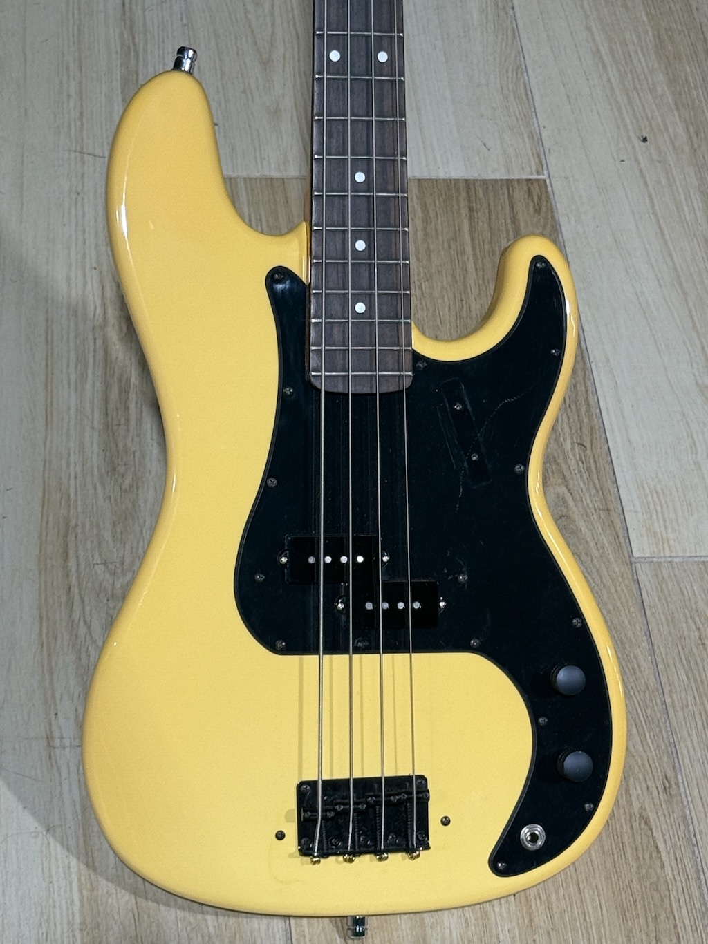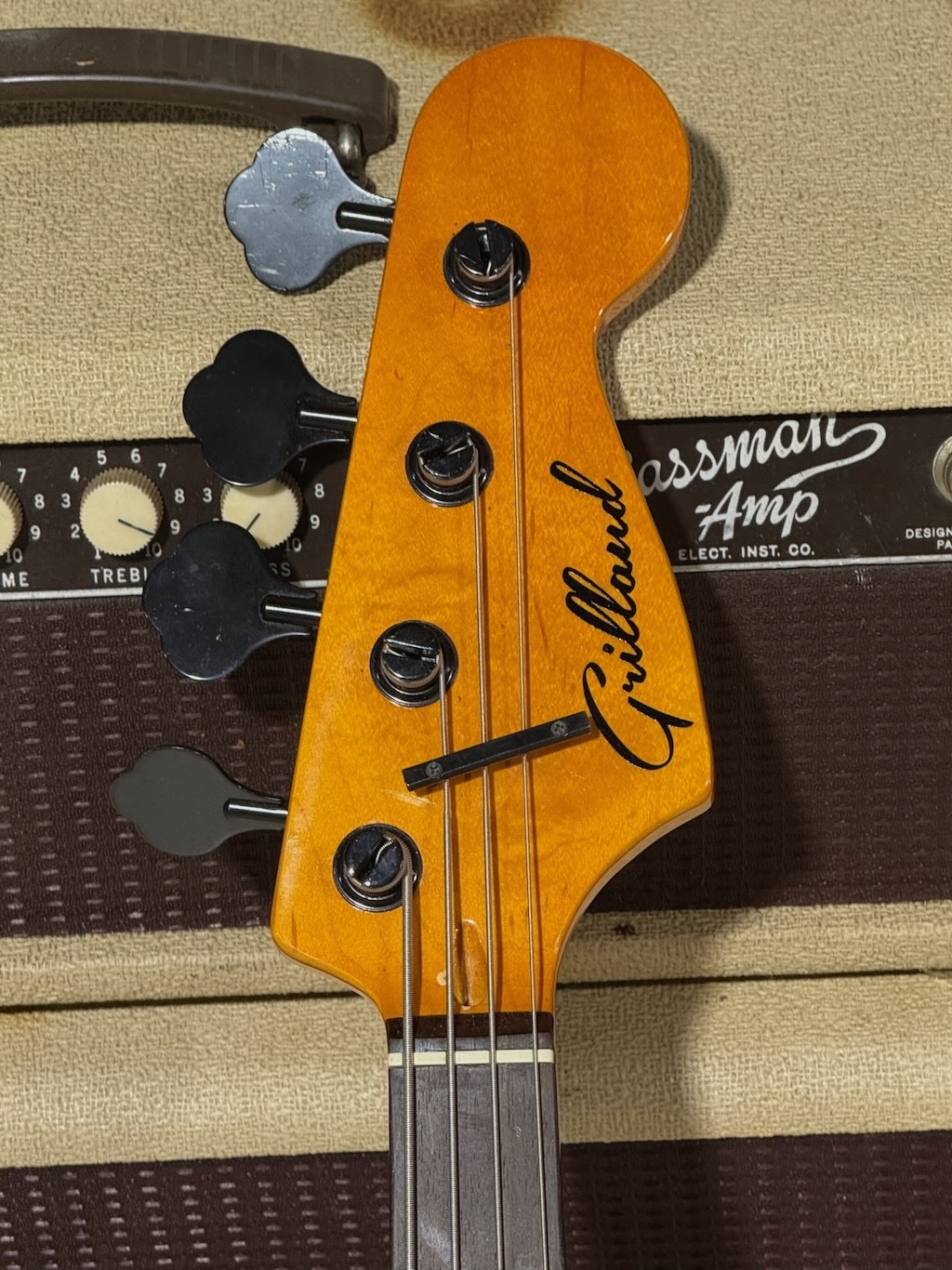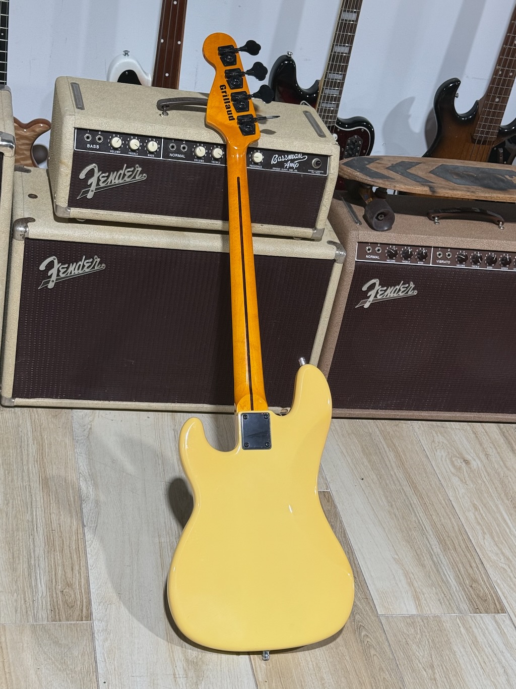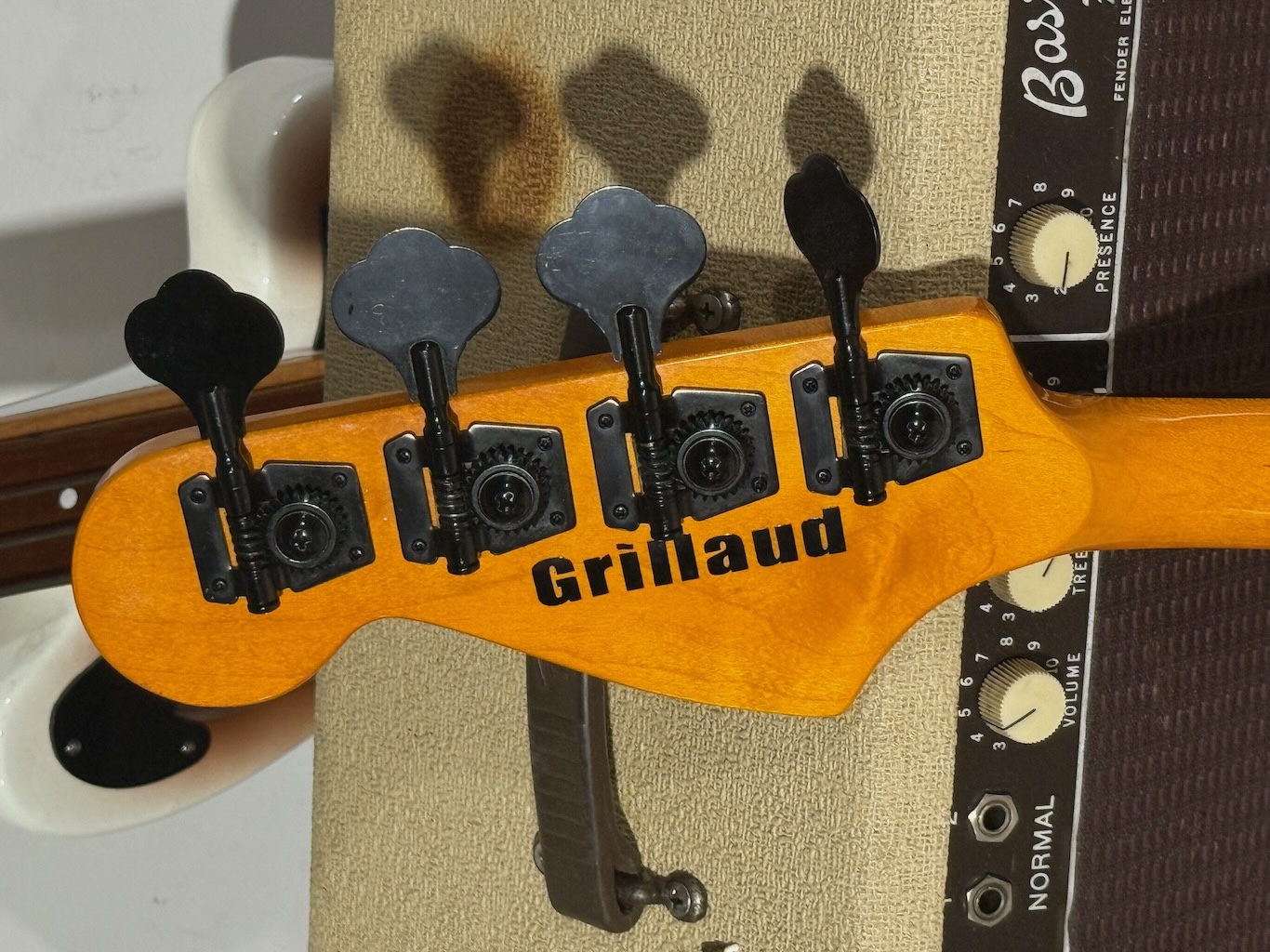 How about a cool & affordable recent Grillaud Bass, a nice Precision Bass copy, a lightweight Asian made bass in perfect shape. Its groovy Olympic White finish is gorgeous & its rosewood neck plays great. Its Black pickgard brings this all together. She has the look of a $1500. bass for a fraction of that price. It’s excellent & comes with no case.