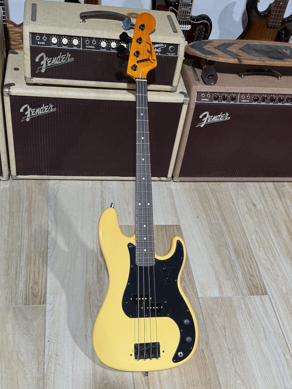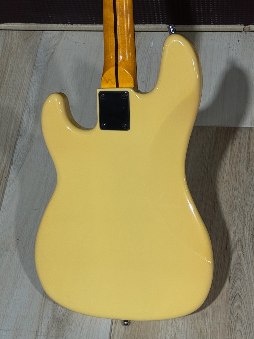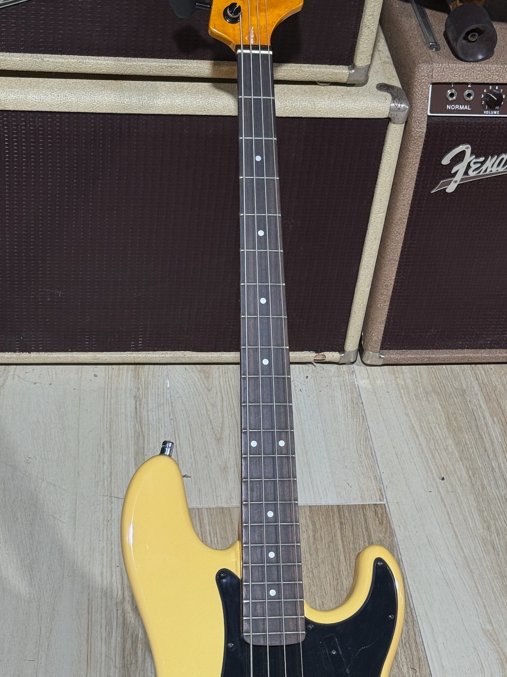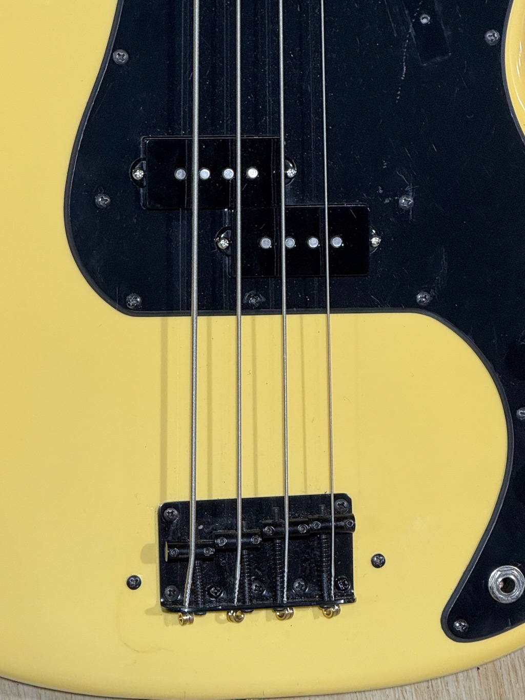 How about a cool & affordable recent Grillaud Bass, a nice Precision Bass copy, a lightweight Asian made bass in perfect shape. Its groovy Olympic White finish is gorgeous & its rosewood neck plays great. Its Black pickgard brings this all together. She has the look of a $1500. bass for a fraction of that price. It’s excellent & comes with no case.